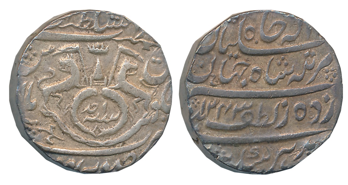 Saharanpur, Silver Rupee, in the name of Shah Alam II, AH 1207/ RY 34, Complete Mint name on top of reverse (M&W# T1a). Slab & Graded by NGC as MS66. Extremely rare in this grade.