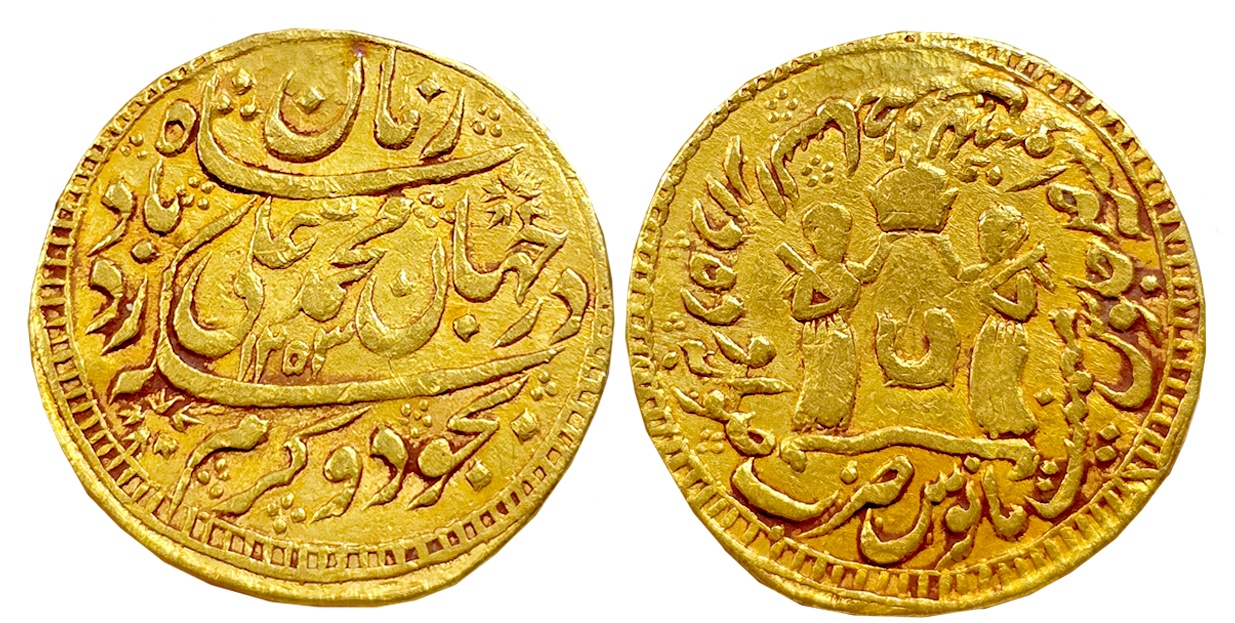 Saadat Ali Khan II, Gold Ashrafi, 10.71g, Muhammadabad Banaras Mint, in the name of Shah Alam II, AH 1220/ RY 26, Persian legend on both sides, Obv: “Sikka zad bar haft kishwar saya yi fazl ham iyi din I ilah Muhammad shah alam Badshah” Rev: “Zarb banaras sanah 26 julus manus maimanat Muhammadabad” (Master & Kapoor# 6.35). Extremely fine, extremely rare.