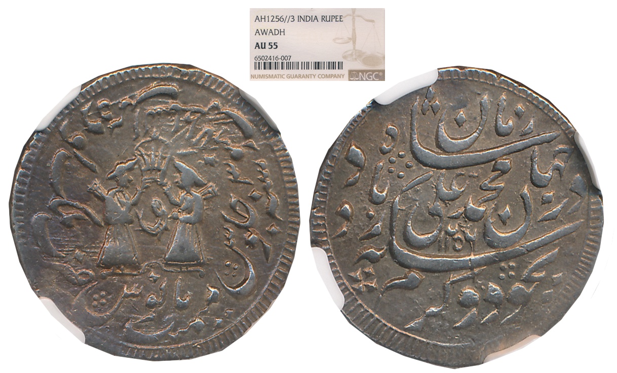 Ghazi ud din Haidar Shah, Silver Rupee, 11.08g, Suba Awadh Dar ul Amarat Lakhnau Mint, AH 1235/ RY Ahad, Crown flanked by rampart Lions holding flag, two upright Fish below on obverse (Master & Kapoor# 7.22). Toned, very fine+.
