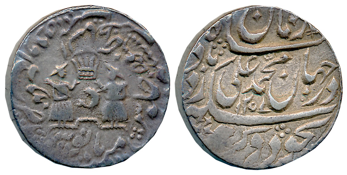 Nasir ud din Haider Shah, Silver Rupee, 11.07g, Suba Awadh Dar us Sultanate Lakhnau Mint, AH 1243/ RY Ahad, Crown flanked by rampant Lions holding flag, two upright Fish below on obverse (Master & Kapoor# 8.04). Extremely fine.