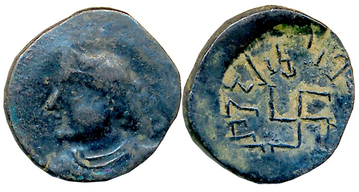 Pallavas of Kanchi, Potin, 4.14g, Obv: Bull standing to right, wave line above within dotted circle, Rev: Large Sun like chakra (Pieper# 2869). Extremely fine, rare.