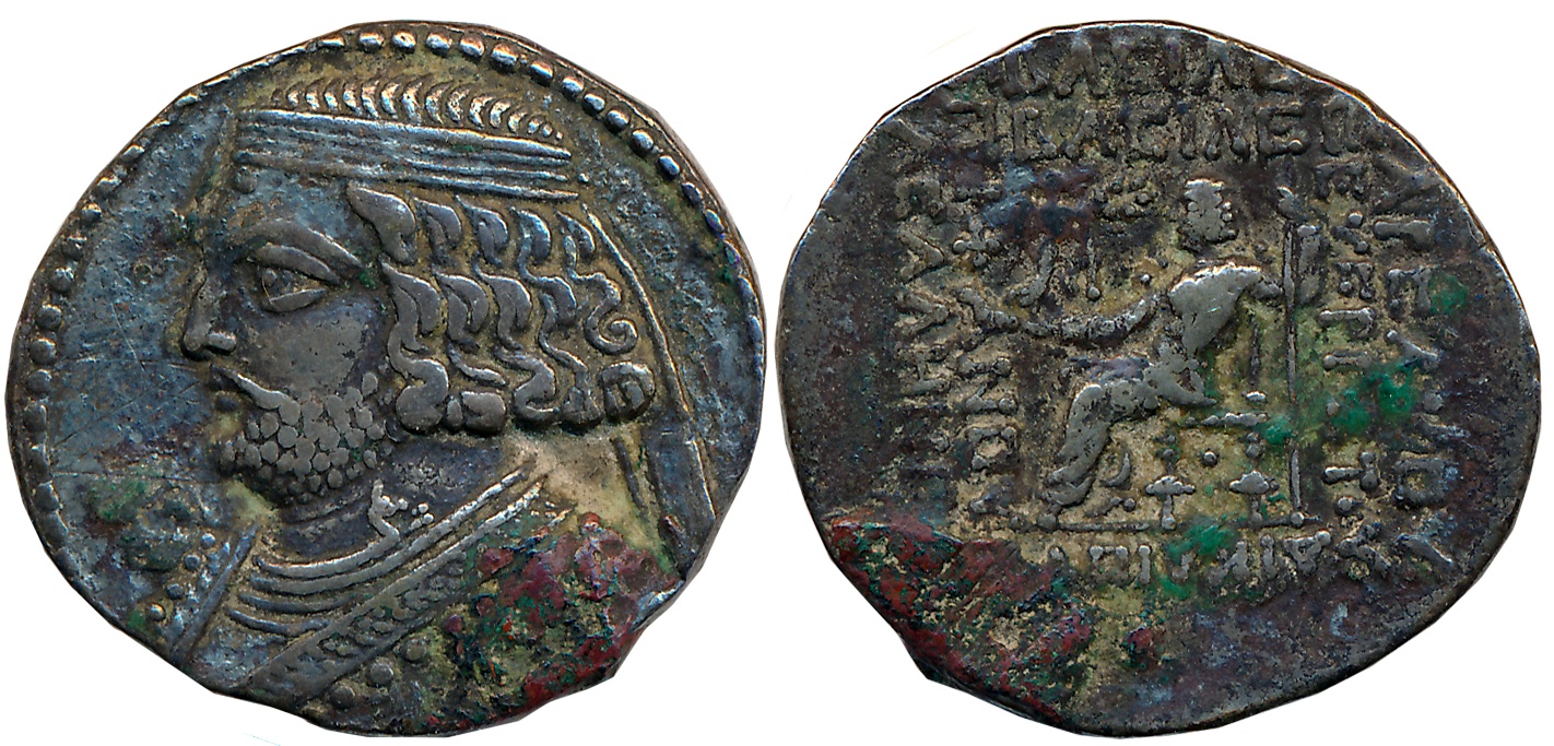Parthia, Vonones II, Silver Drachm, 3.66g, Ecbatana Mint, Obv: Head facing, short beard, wart on brow, tiara with lateral horn motif and ear flaps, stars on both sides, Rev: Archer seated on throne facing right, extending a strung bow, mint mark below, crude Greek legend in 7 lines (Sellwood 67). Very fine+, rare.