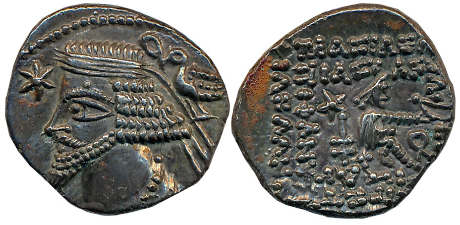 Parthia, Osroes II, Silver Drachm, 3.74g, Ecbatana Mint, Obv: Head facing left, wearing tiara with pellets on stalks on the crest, long pointed beard, vertical line of pellets on the side of tiara, segmented necklet, four pendent ends to diadem, Rev: Archer seated on throne facing right, extending a strung bow, crude Greek legend in 5 lines (Sellwood 85). Extremely fine, rare.