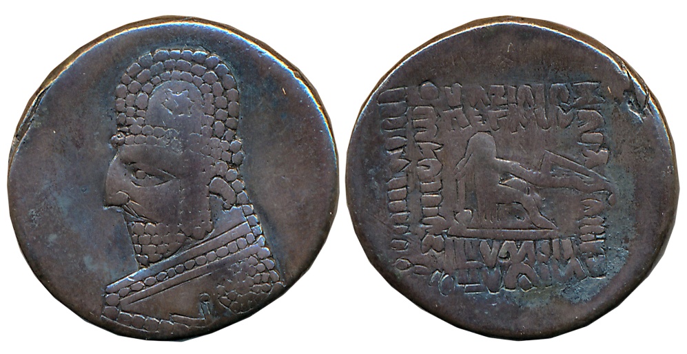 Parthia, Orodes II, Silver Drachm, 3.81g, Mithridatkart Mint, Obv: Head facing left, wearing diadem, short curly beard, crescent behind the head, Rev: Archer seated on throne facing right, extending a strung bow, mint karu below, Greek legend in 7 lines (Sellwood 46). Extremely fine, rare.