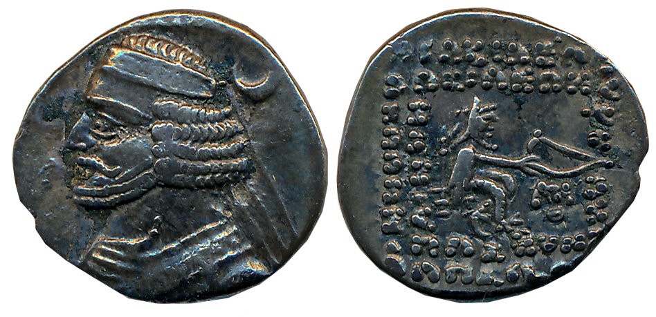 Parthia, Phraates IV, Silver Drachm, 4.01g, Laodicea Mint, Obv: Head facing left, wearing tiara with stag like decoration on the crest, long beard, Rev: Archer seated on throne facing right, extending a strung bow; crude Greek legend in 5 lines (Sellwood 53). About extremely fine, rare.