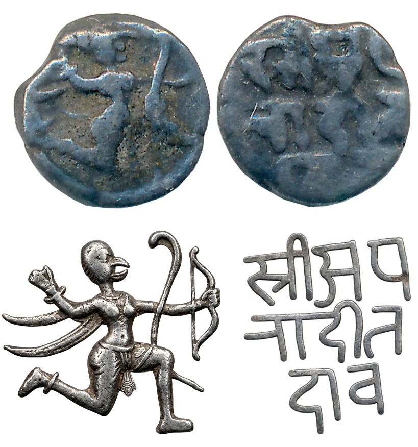 Kalachuris of Tripuri, Gangeya Deva, Gold 4 1/2 Masha, 4.02g, both sides within dotted circle, Obv: Seated Goddess Lakshmi, Rev: Devnagari Legend “Srimat Ga/ngeya De/vah” in 3 lines (Deyell# 119a). Extremely fine.