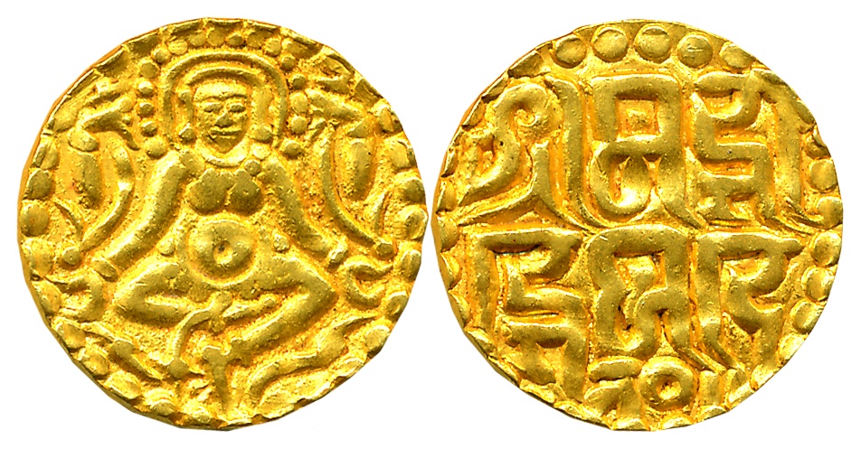 Kadambas of Hangal, Gold Gadyana, 4.22g, Obv: Lord Hanuman seated facing to right, chowris and shankha on each side, Kannada legend “Nakara” below, Rev: Ornamental scroll work (Mitch# K&A 229-231). About extremely fine, very rare.