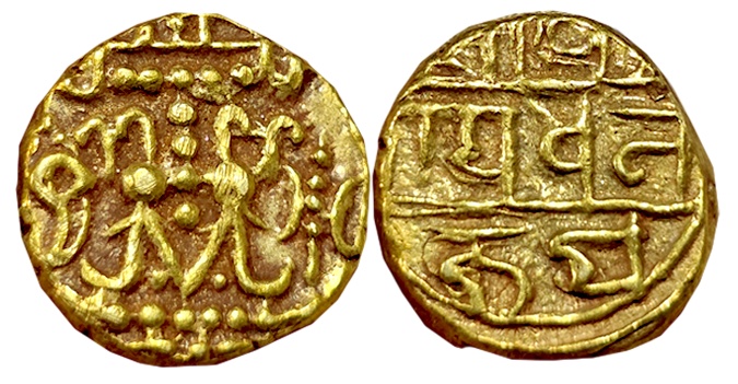 Kadambas of Hangal, Toyimadeva, Gold Varaha, 4.21g, Obv: Lion advancing right with its head turned back, raising left paw; dot within curvature of tail, “Salaga” in Kanada in exergue, Rev: Scroll within decorative border (Mitch# K&A 225-227, K Ganesh# 6.3). Uneven edge between 12 to 1AM otherwise very fine+, rare.