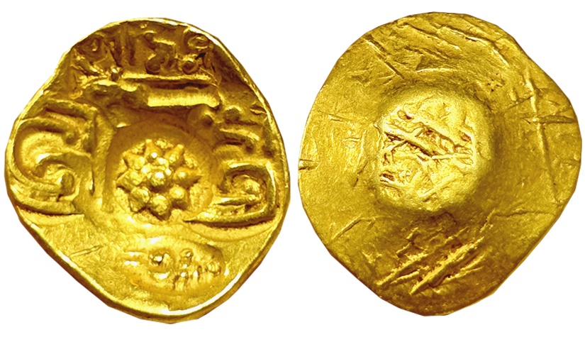Kakatiyas of Warangal, Punch Marked Gold Gadyana, 3.59g, attributed to Ganapati Deva, in the name of Raya Gajakesari, Obv: Nine punches - 1x Boar in centre, 2x Kannada letter “Sri”, 4x “Lotus” flower symbol, 1x Kannada legend “Raya Gaja” and 1 x Kannada legend “Kesari”. Extremely fine, very rare.
