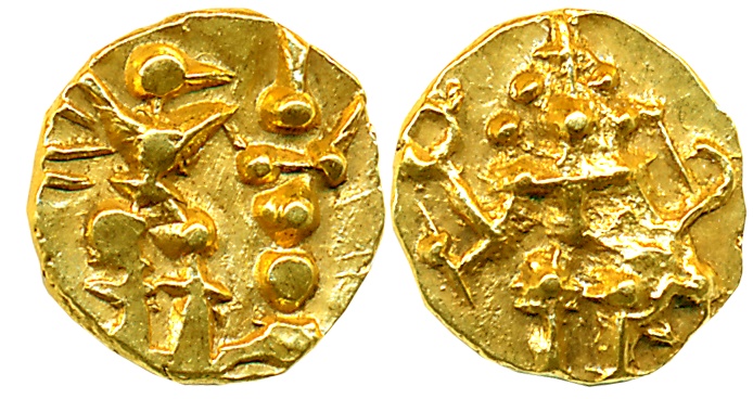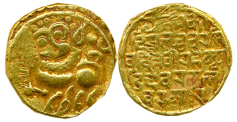 Medieval Goa, Interregnum in Kadamba period, Gold Gadyana, 4.39g, in the name of Mayindeva, cyclic year: Manmatha’, Obv: Lion facing left with gaping mouth. Cyclic year mentioned in Nagari to left, Rev: Nagari legend in four lines “Shri Saptako/ tiswara Charana Labdha vara / …Mayindeva”. Very fine, extremely rare.