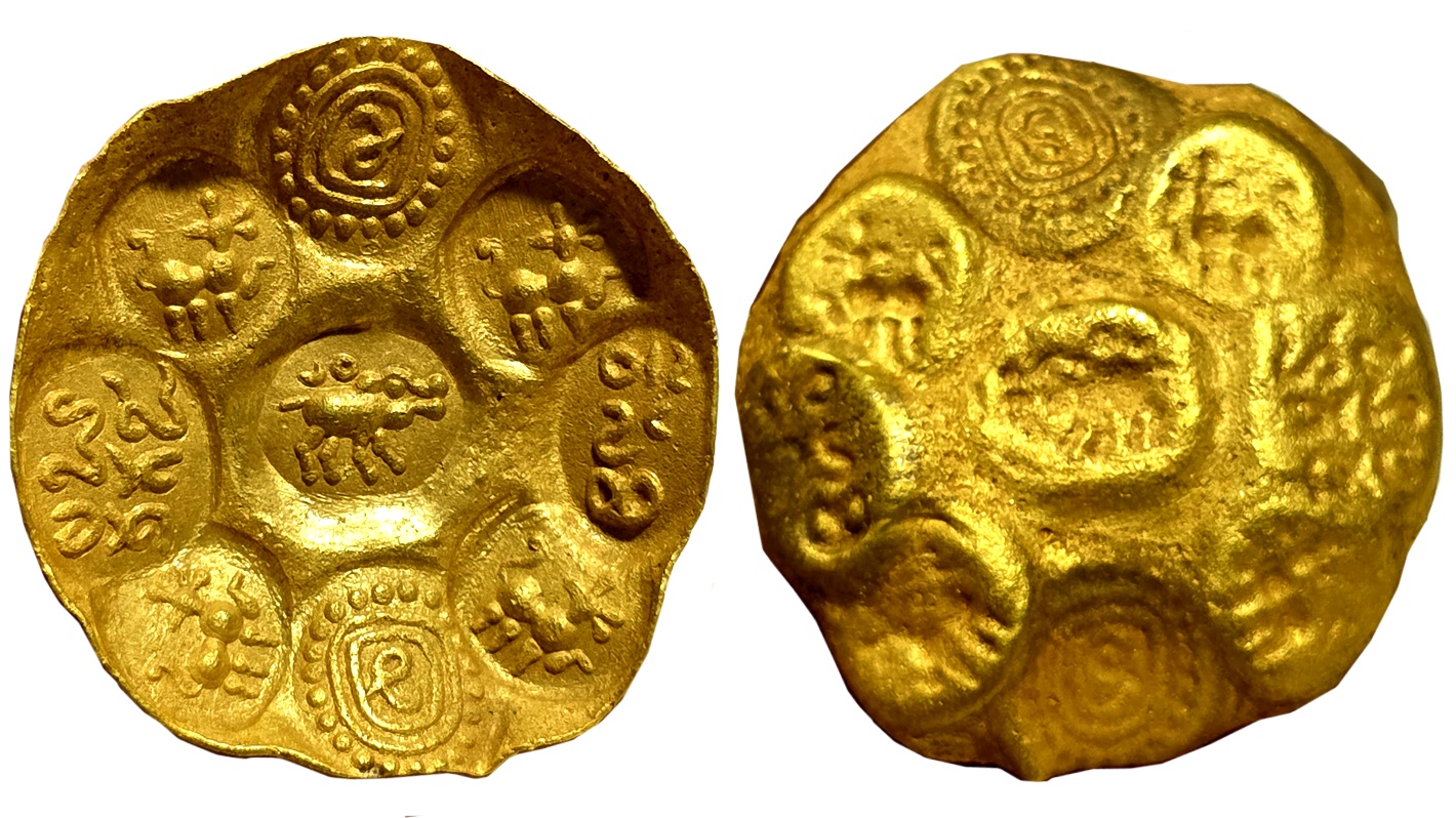 Telugu Cholas, Nidugal (Nellore) branch, Manuma Siddhi III, Gold Gadyana, 3.42g, Obv: Garuda running to right in a Chapetadāna Mudra, Rev: Telugu legend “Dānava Murāri Bantaru” in three lines. (K Ganesh# 12.10). Very fine+, extremely rare.