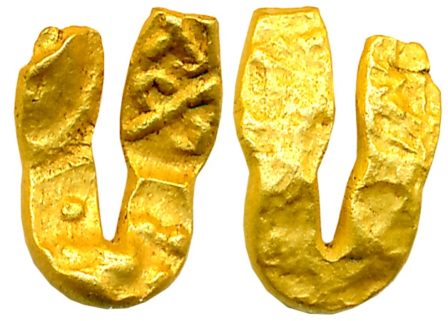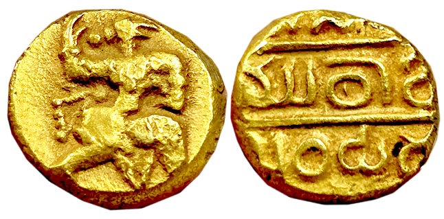 Early Vijaynagar Period, Gold Ramatanka Temple Token, ca. 15-16th cent.AD, scyphate shape, 13.40g, Obv: Scene of Lord Rama’s Pattābhishekam – Lod Rama and Goddess Sita enthroned facing, flanked by attendants; below, Lord Hanuman kneeling with attendants, Rev: Lord Hanuman within a six-pointed star; stylized Devnagari legend around (similar to Mitchiner-5). Very fine, extremely rare. A rare example of early Vijayanagar period scyphate temple token with clear and attractive elaborate design elements.