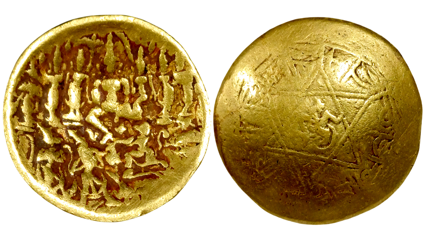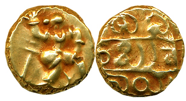 Vijaynagar Empire, Achyutadevaraya, Gold Varaha- Hon, 3.40g, “Gandabherunda” type, Obv: Two headed mythical bird Gandabherunda facing front, holding four Elephants, Rev: Devnagari legend “Sri Pratapachuta raya” (K Ganesh# 9.96). Very fine, rare.