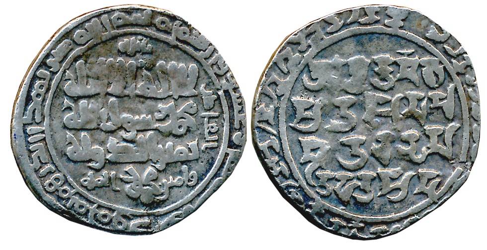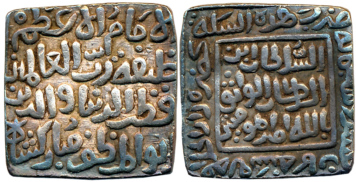 Shams al-Din Iltutmish by Ghiyath al-Din Iwad, Silver Tanka, 10.39g, Obv: A Horseman riding left in a circle, surrounded by the Shahāda and the date in words, Rev: Arabic legend “al-sulṭān al-mu‘aẕẕam shams al-dunyā wa al-dīn abū al-muẕaffar īltutmish al-quṭbī nāṣir amīr al-mūmineen”; Devanagari letter “Bho” after third line (G&G# B18). Very fine, extremely rare.