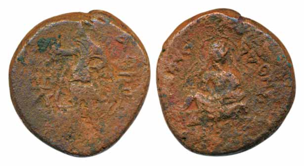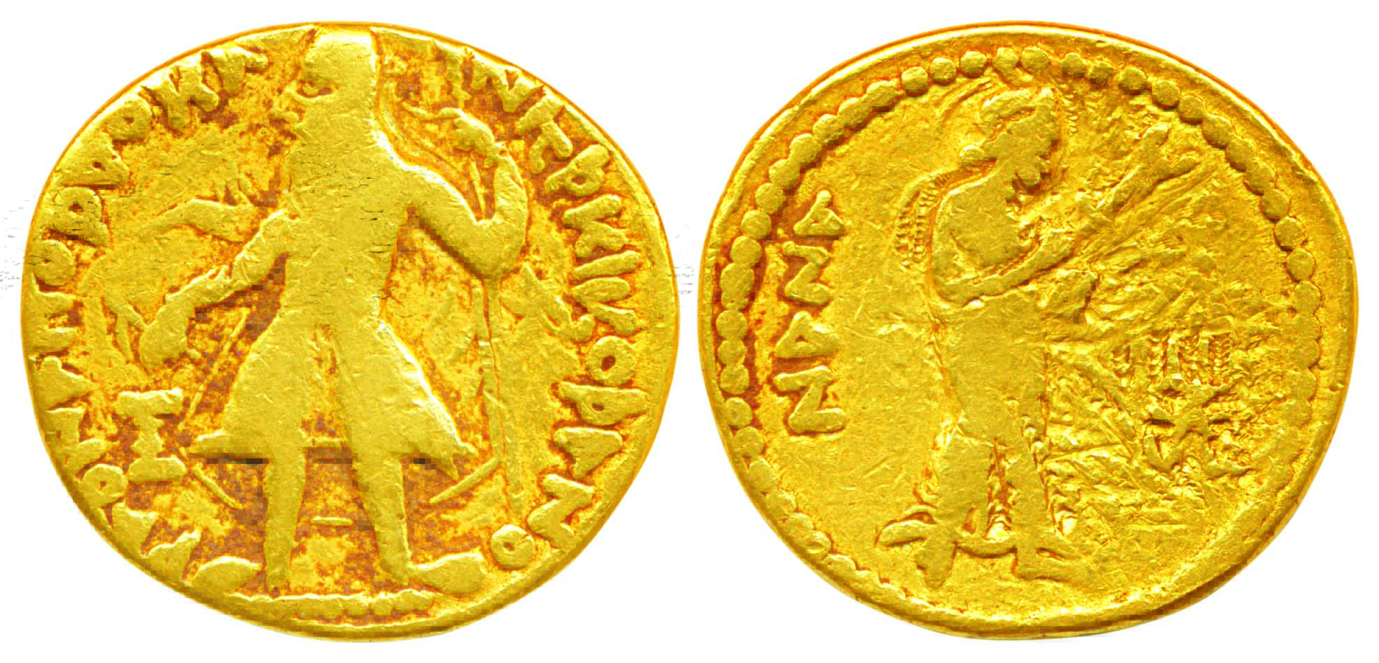 Satavahanas, Vashistiputra Sri Pulumavi, Silver Drachm, 2.04g, Nasik Portrait Series, Obv: King’s right side profile with curled ornamental hair style and large earrings, Distinct Brahmi legends beginning 12 O’ clock ‘Rajno… Vasithiputasa’ and beginning at 8 O’ clock ‘Siri Pulumavisa’; Rev Ujjaini symbol on left flanked by hill surmounted by Sun and two crescents with river below and fine Telugu Brahmi legend (Mitch IGISC # 1338). Well struck fine legends. Very fine, rare.