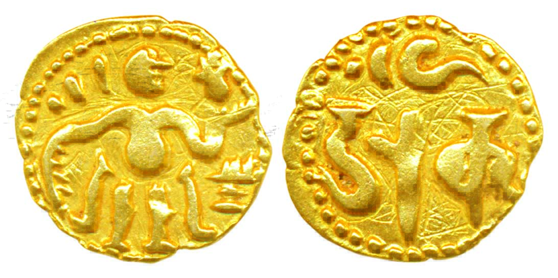 Shilaharas of Karad, Gold Double Fanam, 0.77g, Obv: Trisul, Rev: globule (Mitch# K & A 246). Very fine, scarce.