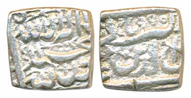 Akbar, Silver Square Rupee, 11.26g, Bang Mint, mint name as al zarb bang at bottom on rev, AH 987 with retrograde 9. Test marks, Very fine+, rare.