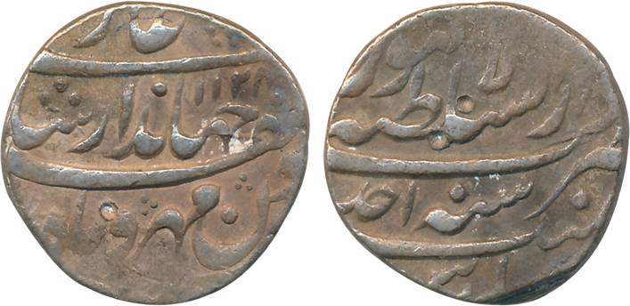 Jahandar Shah, Silver Rupee, 11.16g, “Sahib Qiran” type, Lakhnau Mint, AH 1124/ RY Ahad (KM# 364.15). Very fine+, rare.