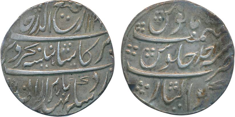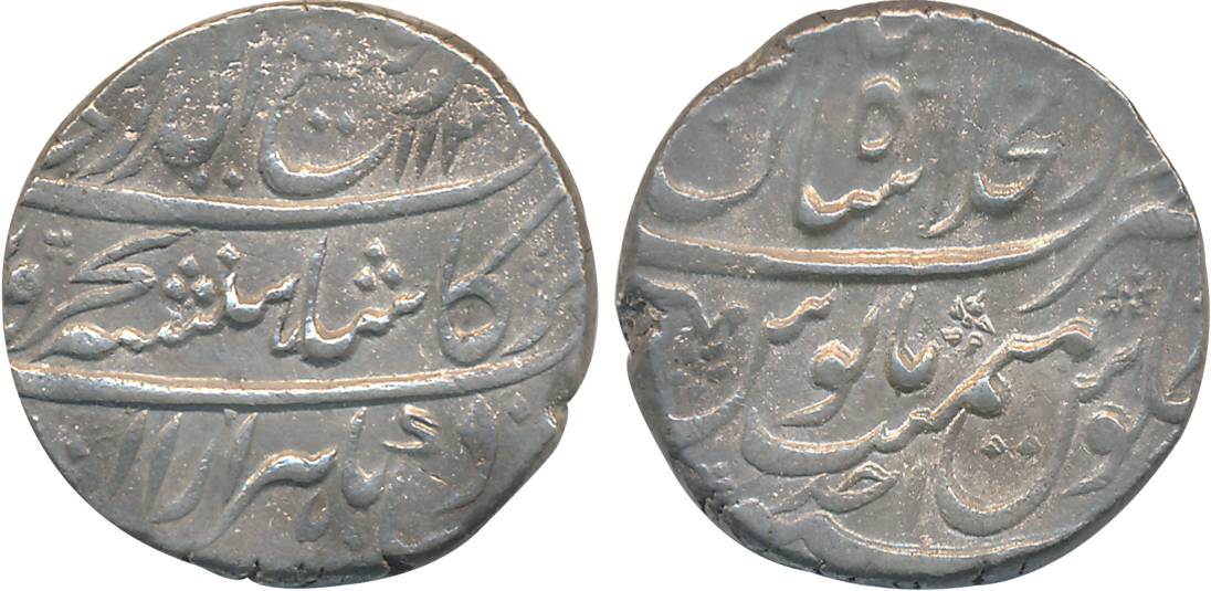 Rafi ud Darjat, Silver ½ Rupee, 5.66g, Khambayat Mint, RY Ahad (Not listed in KM). Complete mint name on bottom of rev, cleaned, very fine+, extremely rare.