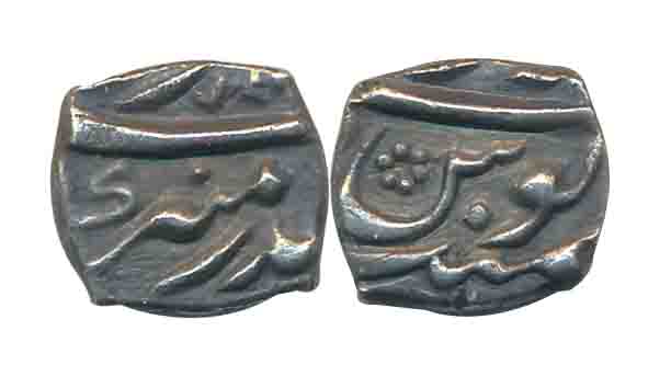 Aurangzeb, Silver, 1/16 Rupee, 0.66g, mint name off flan but stylically of Surat Mint. Uncleaned, very fine, very rare.