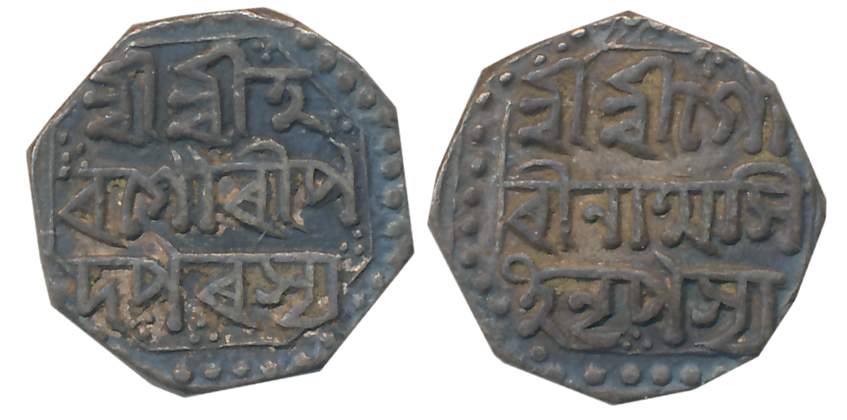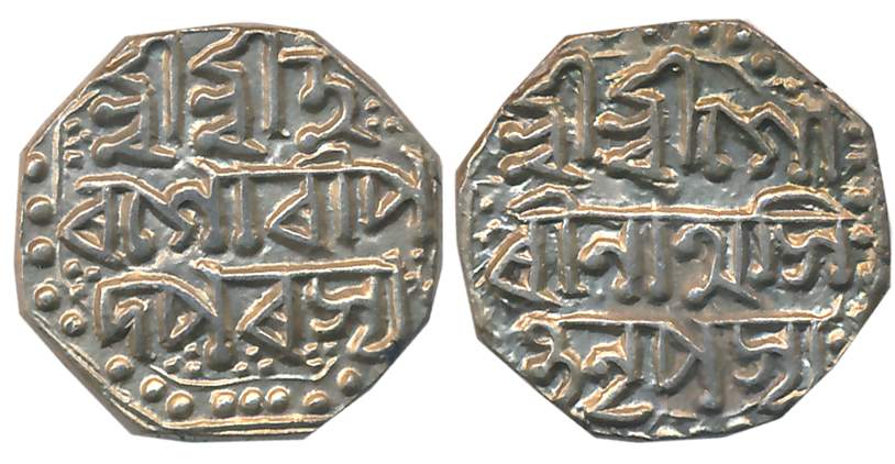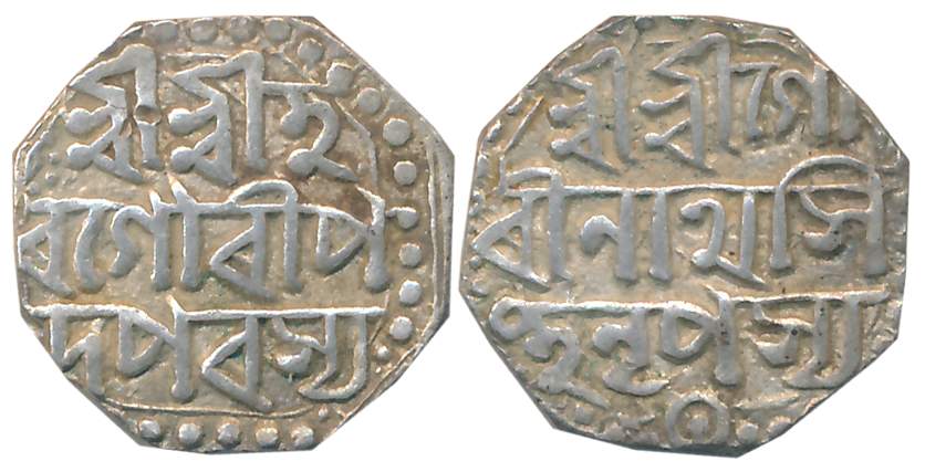 Gaurinatha Simha, Silver 1/2 Rupee, 5.61g, Assamese legend on both sides within dotted border, Obv: “Sri Sri Ha/ra Gauri Pa/da Parasya”, Rev: “Sri Sri Gau/rinatha Sim/ha Nrpasya”, Cross with divided ends below (R&B# R85.1). Very fine.
