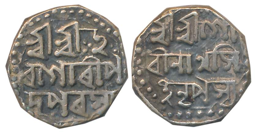 Gaurinatha Simha, Silver 1/2 Rupee, 5.70g, Assamese legend on both sides within dotted border, Obv: “Sri Sri Ha/ra Gauri Pa/da Parasya”, 3 dots top right, 6 dots to right and bottom, Arc of dots upper left, Rev: “Sri Sri Gau/rinatha Sim/ha Nrpasya”, 3 dots upper right and center bottom, different die (Unlisted in R&B). Very fine.