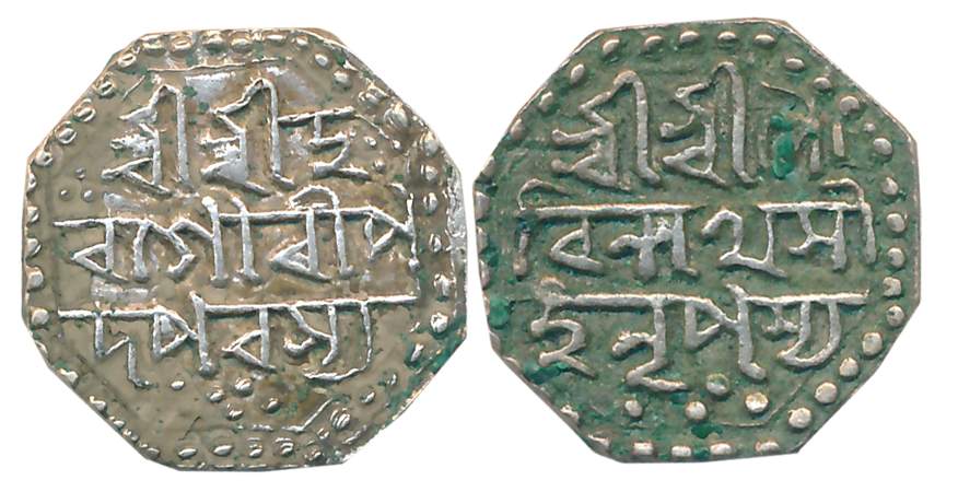 Gaurinatha Simha, Silver 1/2 Rupee, 5.56g, Assamese legend on both sides within dotted border, Obv: “Sri Sri Ha/ra Gauri Pa/da Parasya”, 3 dots before to “Ha”, Rev: “Sri Sri Gau/rinatha Sim/ha Nrpasya” (Unlisted in R&B). Very fine.