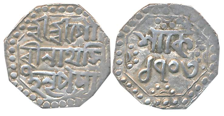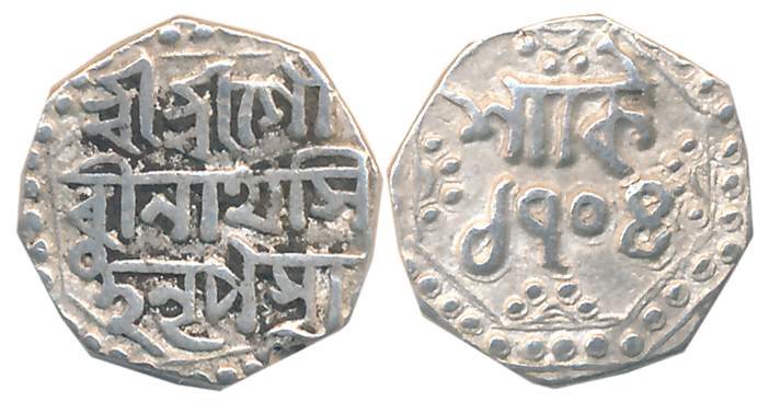 Gaurinatha Simha, Silver 1/2 Rupee, 5.62g, Assamese legend on both sides within dotted border, Obv: “Sri Sri Ha/ra Gauri Pa/da Parasya”, Arc of dots upper right, 3 dots at center top and right, Upper left and bottom left, Rev: “Sri Sri Gau/rinatha Sim/ha Nrpasya” (Unlisted in R&B). Very fine.