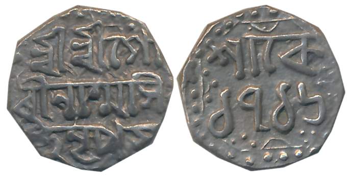 Gaurinatha Simha, Silver 1/4 Rupee, 2.84g, SE 1709/ 8, Assamese legend on both sides within dotted border, Obv: “Sri Sri Gau/rinatha Si/mha Nrpasya”, Rev: “Sake/ 1709/ 8”, Year 8 in lower margin, crescent and dot very small, Arcs of dots centre top, left and bottom, right (R&B# R103.1). Very fine.