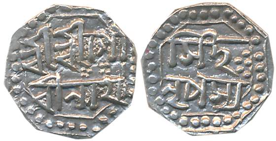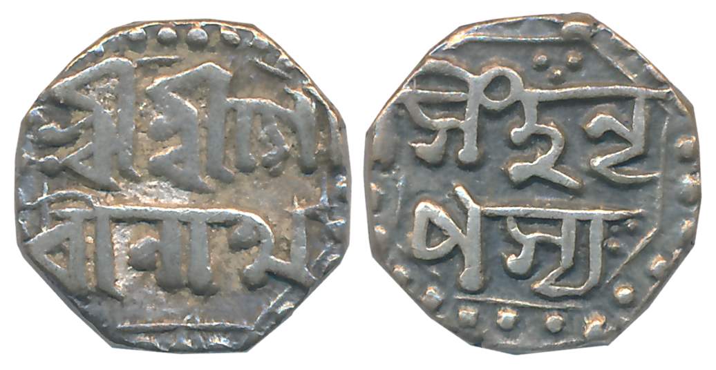 Gaurinatha Simha, Silver 1/8 Rupee, 1.45g, Assamese legend on both sides within dotted border, Obv: “Sri Sri Gau/rinatha”, Arcs of dots centre bottom, Rev: “Simha/ Nrpasya”, 4 dots center of right, Possibly die of 1/16th Rupee in error (Unlisted in R&B). Very fine.