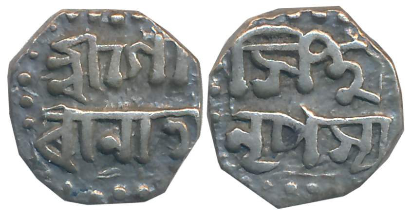 Gaurinatha Simha, Silver 1/8 Rupee, 1.39g, Assamese legend on both sides within dotted border, Obv: “Sri Sri Gau/rinatha”, Rev: “Simha Nr/pasya”, 3 dots upper right, bottom right (same as R&B# R124.1 but die different). Very fine.