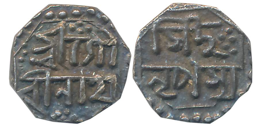 Gaurinatha Simha, Silver 1/8 Rupee, 1.42g, Assamese legend on both sides within dotted border, Obv: “Sri Sri Gau/rinatha”, Rev: “Simha/ Nrpasya”, Arcs of dots centre right, Possibly die of 1/16th Rupee in error (R&B# R126.1). Very fine.
