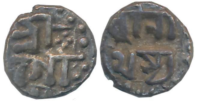 Gaurinatha Simha, Silver 1/16 Rupee, 0.70g, Assamese legend on both sides within dotted border, Obv: “Sri Gau/rinatha”, Rev: “Simha/ Nrpasya”, “Na” below, (obverse die same as R&B# R128.2 and reverse die same as R&B# R129.1). Very fine.
