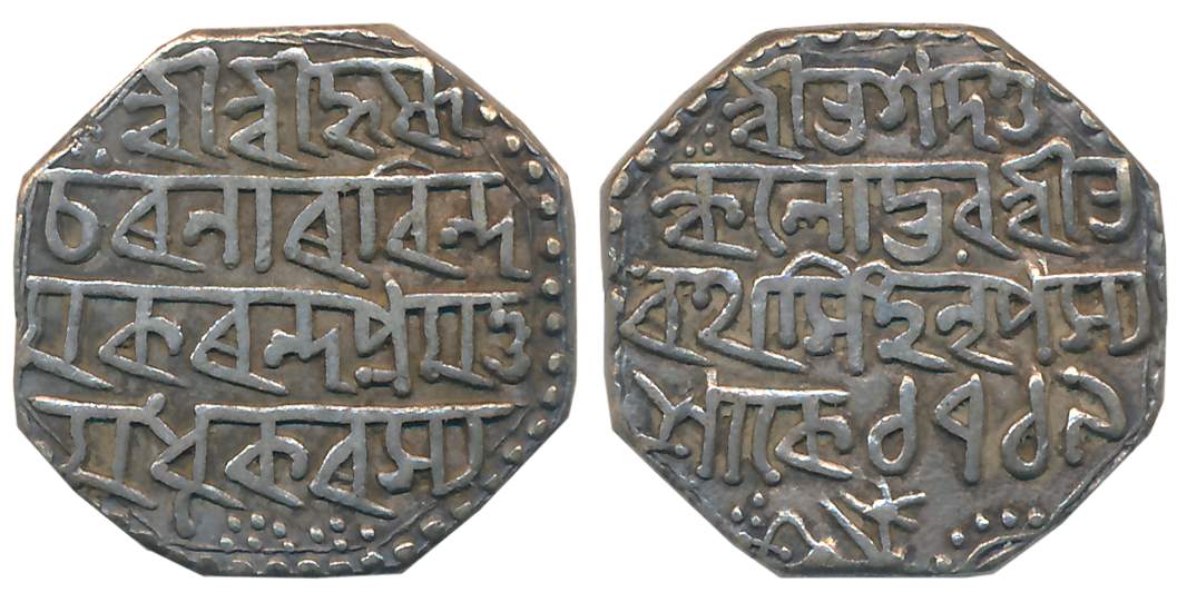 Gaurinatha Simha, Silver 1/32 Rupee, 0.37g, Assamese legend on both sides within dotted border, Obv: “Sri/ Gau”, “Di” to right of “Sri” with short “i”, Rev: “-rina/thasya”, (R&B# R134.1). Very fine.