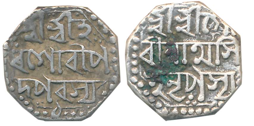Gaurinatha Simha, Silver 1/2 Rupee, 5.64g, Year 8, Assamese legend on both sides within dotted border, Obv: “Sri Sri Ha/ra Gauri Pa/da Parasya”, flower of dots upper right, Rev: “Sri Sri Gau/rinatha Sim/ha Nrpasya/8”, Year 8 in bottom line, Arc with dots bottom right and top left,4 dots bottom left (Unlisted in R&B). Very fine.