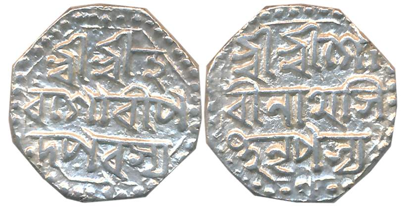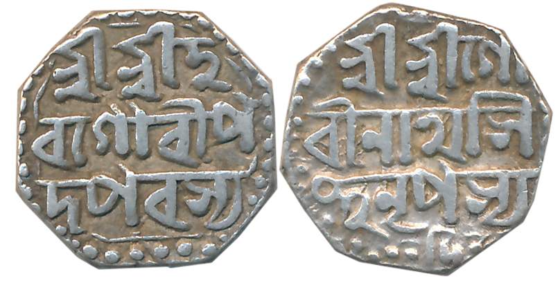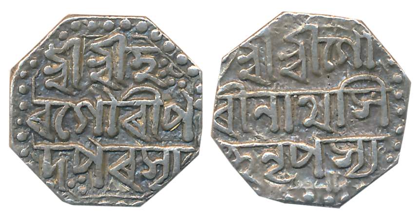 Gaurinatha Simha, Silver 1/2 Rupee, 5.72g, Year 1, Assamese legend on both sides within dotted border, Obv: “Sri Sri Ha/ra Gauri Pa/da Parasya/ 1”, with Year 1 in bottom margin, Rev: “Sri Sri Gau/rinatha Sim/ha Nrpasya” (Unlisted in R&B). Very fine