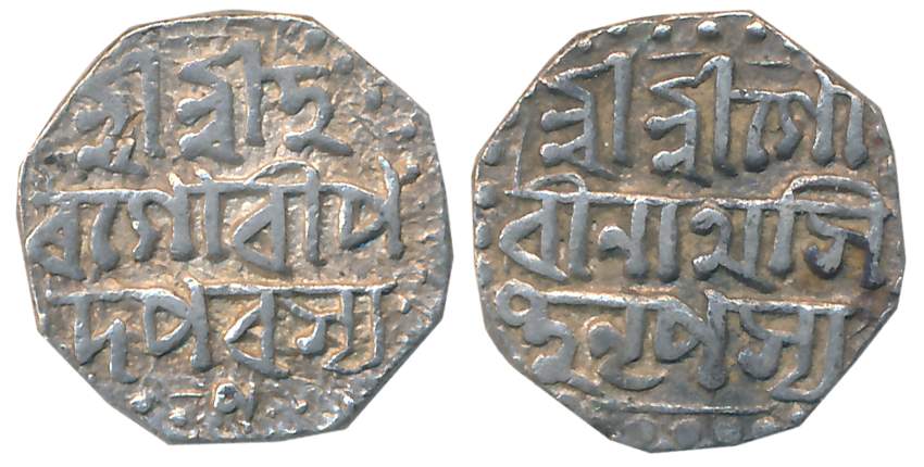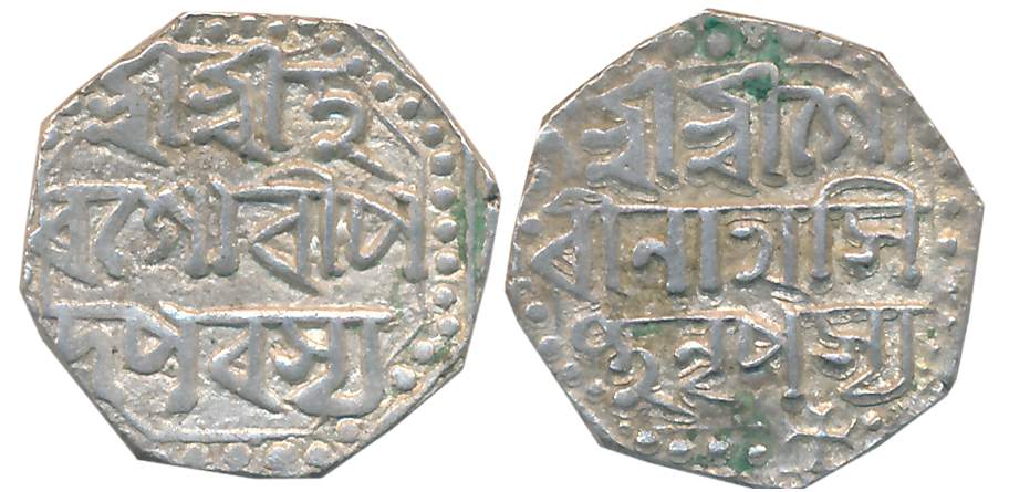 Gaurinatha Simha, Silver 1/2 Rupee, 5.71g, Assamese legend on both sides within dotted border, Obv: “Sri Sri Ha/ra Gauri Pa/da Parasya”, Rev: “Sri Sri Gau/rinatha Sim/ha Nrpasya”, “Na” in bottom border (R&B# R79.1). Very fine