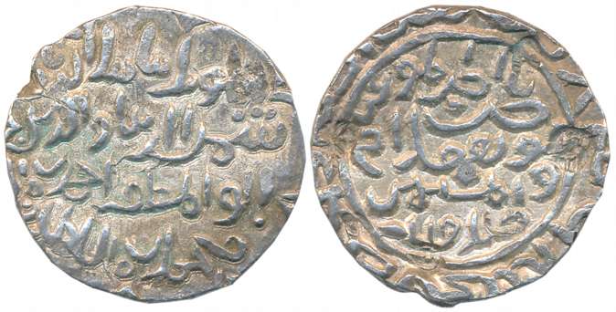 Jalal al din Fath, Silver Tanka, 10.60g, Muhammadabad Mint, AH 887 (G&G# B604). Two Shroff marks. Very clear Mint name, very fine, very rare.