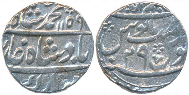 Muhammad Shah, Silver Rupee, 11.24g, Farkhanda Bunyad Hyderabad Mint, RY 4 on obverse (KM# 436.26). Very fine.