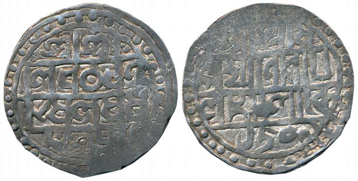 Ram Simha II, Silver Rupee, 8.70g, SK 1712, Bangla legend on both sides, Obv: Sri Sri Siva Charana kamala Madhu Karasya, Rev: Sri Sri Jayantipura Purandarasya Sake 1712 (KM# 206). Weakly struck, good.