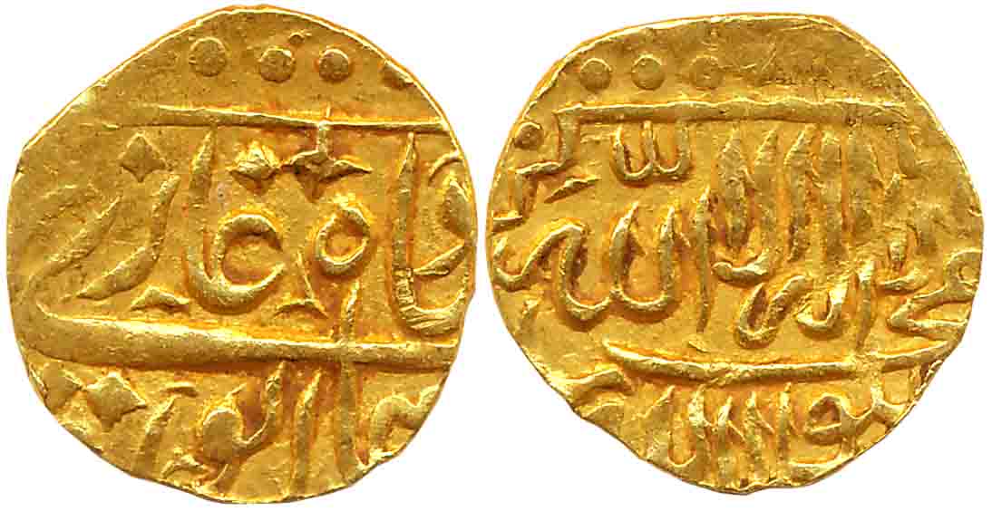 Humayun, Silver 1/2 Shahrukhi, 2.38g, Qandahar Mint, Obv: Muhammad Humayun Ghazi in Mihrab-shaped cartouche, Rev: Kalima in circular border with additional invocation “Yarzaq Allah Man Yashao Baghayr Hisab”, names of Caliphs and their titles around. Usual weak struck on border otherwise very fine, extremely rare. Fractional Sahrukhis are very rare.
