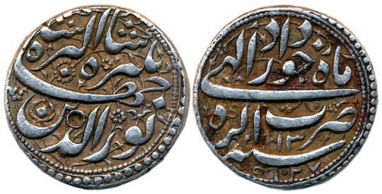 Jahangir, Silver Rupee, 11.30g, “Nur ud din” type, Akbarnagar Mint, RY 9, Ilahi Month Bahaman (KM# 145.4). Very fine.