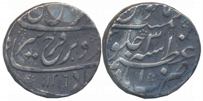 Aurangzeb, Silver Rupee, 11.53g, Dar ul Fath Ujjain Mint, AH 1116/ RY 48, Mint name on bottom of reverse (KM# 300.91). Very fine.