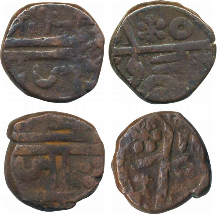 Kok Shah son of Jatba, Copper 1/3 Unit, 4.28g, Obv: Symbol of sword and Devnagari legend “…haraja… baji Suta…” partly visible, Rev: Devnagari legend “…kasahi Mahipati Rao (Devgadh)” seen in parts. Very fine, very rare.