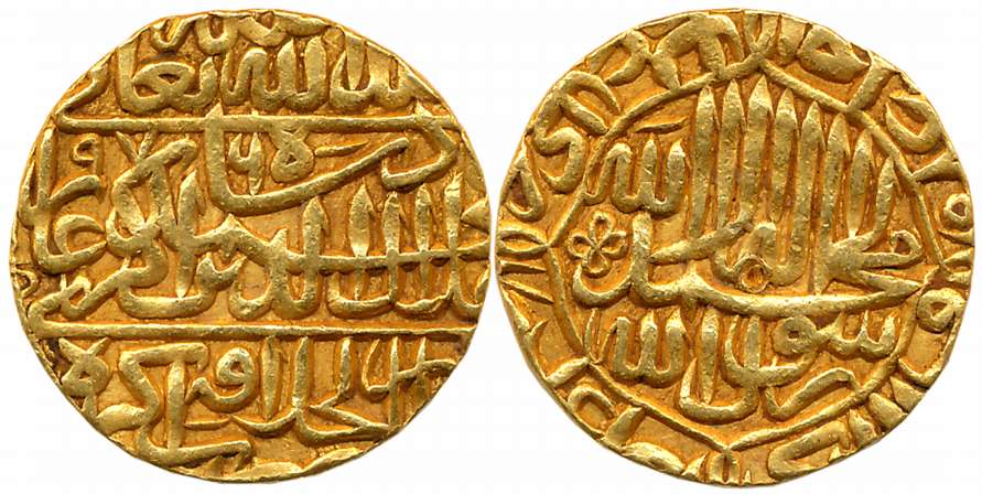 Akbar, Silver Square Rupee, 11.25g, “Kalima” type, Dar us Sultanate Ahmedabad Mint (Name off flan), AH 999, additional word “Ain” on reverse (KM# 82.1). Very fine.