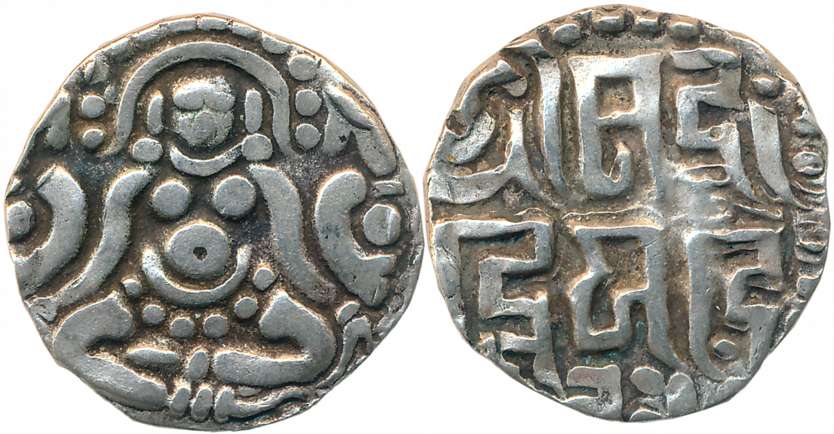 Parmar’s, Bhojdeva, Silver, 0.58g, Obv: Lion standing facing right, Rev: Human figure, Devnagari legend “Sri Bhoj Deva” above. Very fine, rare.