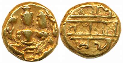 Vijaynagar Empire, Srirangaraya III, Gold 1/2 Varaha, 1.72g, Obv: Lord Venkateshwara standing front under ornamental arch, Rev: 3 line Devnagari legend (K Ganesh # 9.159). Extremely fine, rare.