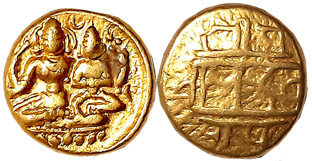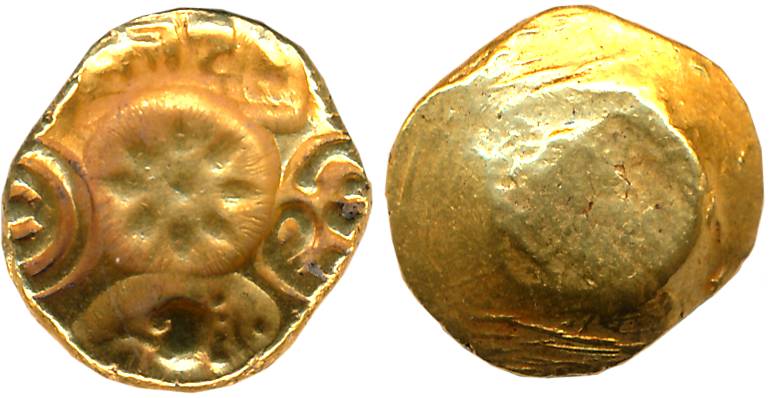 Gangas of Talakadu, Gold Fanam, 0.41g, Obv: Elephant standing and facing right, Rev: Scroll work with beautiful flowers. Very fine.