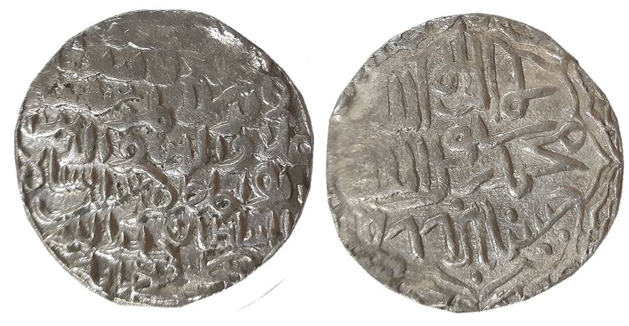 Shams Al-Din Muzaffar, Silver Tanka, 10.81g, Kamta Mardan, Broad flan, AH (898), Obv: Persian legend “Fath al-mulk al 'adil al-badhil al-mujahid sa'd al-din nasir amir al-mu'munin al-mukhatib shams al- dunya wa'l din abu'l nasr”, Rev: Kalima (G&G# B681). About very fine, very rare.