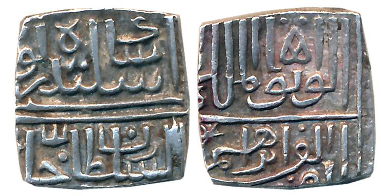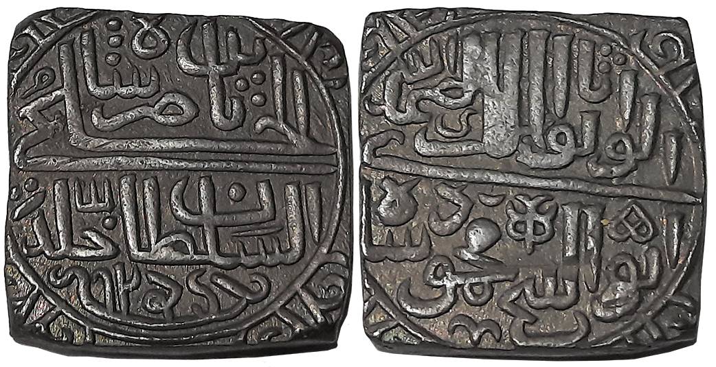 Bahadur Shah, Copper Double Falus, 33.60g, Obv: Persian legend “al-Sultan Bahadur Shah bin Adil Shah”, Rev: Persian legend “al-Wathiq billah al-Mannan Abu al-Fateh Nasir al-Dunya wa al-Din” (Not listed in G&G). Unique so far. Very fine for type, exceedingly rare.